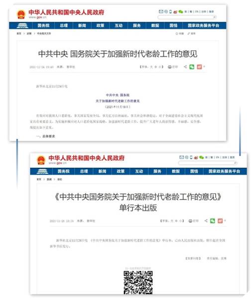 為實施積極應對人口老齡化國家戰略,加強新時代老齡工作,提升廣大老年人的獲得感、幸福感、安全感。日前,中共中央、國務院發布文件《中共中央國務院關于加強新時代老齡工作的意見》(簡稱意見),并已由人民出版社出版單行本。